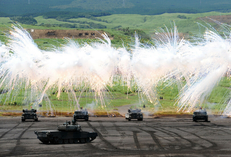 ニュース 政治・経済 陸上自衛隊、「富士総合火力演習」の予行を実施 2012年8月21日 20:00 発信地:御殿場/静岡 [ アジア・オセアニア 静岡 ] このニュースをシェア ‹ › ❮ 18/19 ❯ 陸上自衛隊(Ground Self-Defense Force)が毎年行う「富士総合火力演習」の予行が21日、静岡県御殿場市にある東富士演習場で行われた。富士山(Mt. Fuji)のふもとで実施されるこの演習には、隊員約2400人、戦車・装甲車両80両、航空機・ヘリコプター30機が参加する。写真は弾幕の下を進む戦車(2012年8月21日撮影)。(c)AFP/Yoshikazu TSUNO 画像作成中 ! 【8月21日 AFP】陸上自衛隊(Ground Self-Defense Force)が毎年行う「富士総合火力演習」の予行が21日、静岡県御殿場市にある東富士演習場で行われた。富士山(Mt. Fuji)のふもとで実施されるこの演習には、隊員約2400人、戦車・装甲車両80両、航空機・ヘリコプター30機が参加する。(c)AFP 政治・経済 一覧へ> メディア・報道関係・法人の方向け 写真・動画 購入のお問合せ>