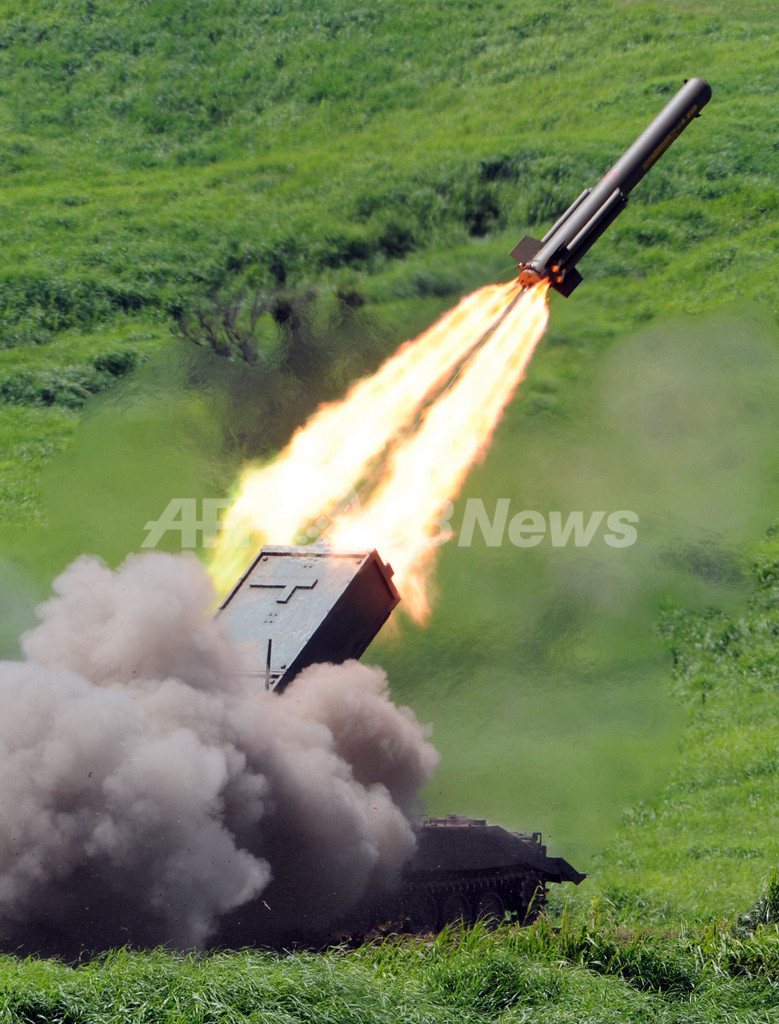 写真はロケット弾を発射する地雷原処理車(2012年8月21日撮影)。(c)AFP/Yoshikazu TSUNO