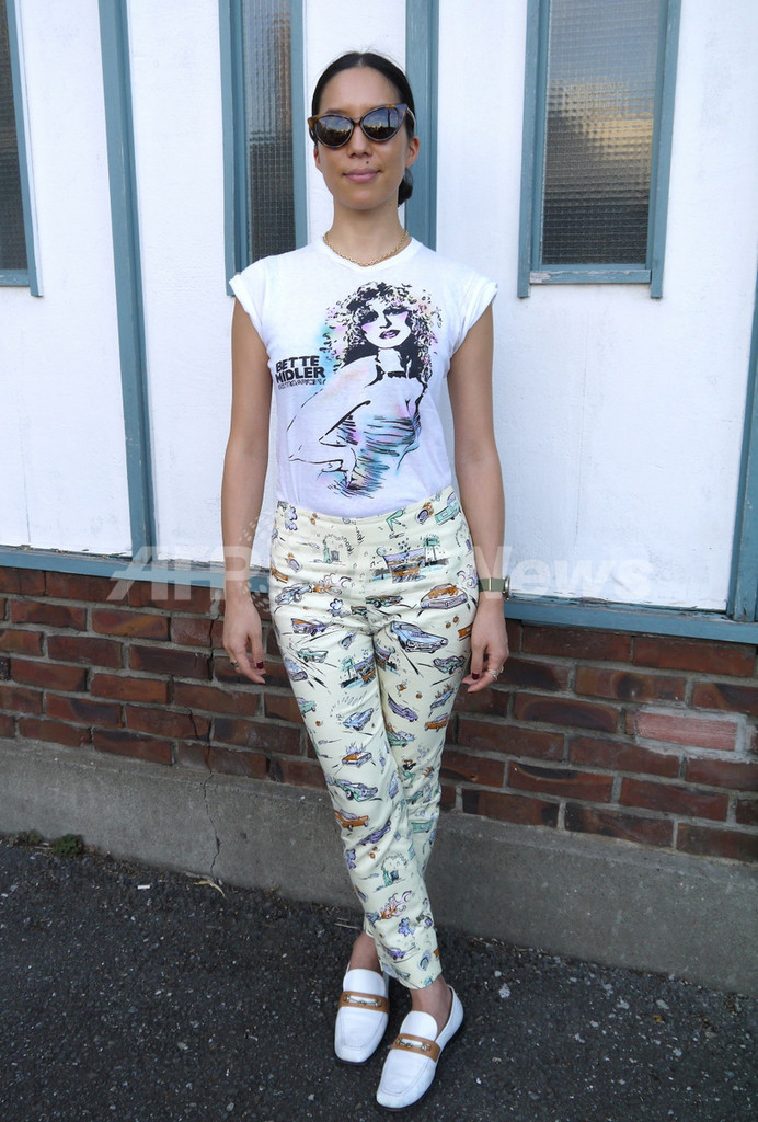 LYDIA(リディア)の本田美奈子(Minako Honda)さんは、最近のマイ定番という“ハイウエスト”なスタイルに「セリーヌ(CELINE)」のビットローファーをコーディネート。淡色のプリントT×プリントパンツに合うこちらは「白いローファーが珍しくて購入した」という一足だ。本田さんのマニッシュシューズコーデのポイントは、“縦長”のシルエットにすること。「今回のローファーなどヒールのない靴の時は、縦長でシャープなシルエットにまとめるようにしています。ヴィンテージTにハイブランドのボトムスというコーデにハマっていて、YSLのタイトスカートなどを合わせたりもします」と本田さん。つい目がいくキャッツアイ型サングラスも、縦長のシルエット作りに効果的だ。