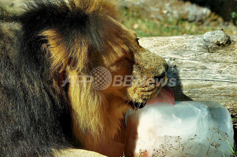 トラやライオンには自分たちの頭ほどの大きさもある巨大な「氷あめ」が、サルにはヨーグルトとスイカ、凍らせたフルーツが詰められた竹筒が与えられている。動物園の職員によれば、この暑さ対策により飼育環境が改善されるのに加え、動物たちが食べ物を手に入れる能力を磨くこともできるという。(c)AFP