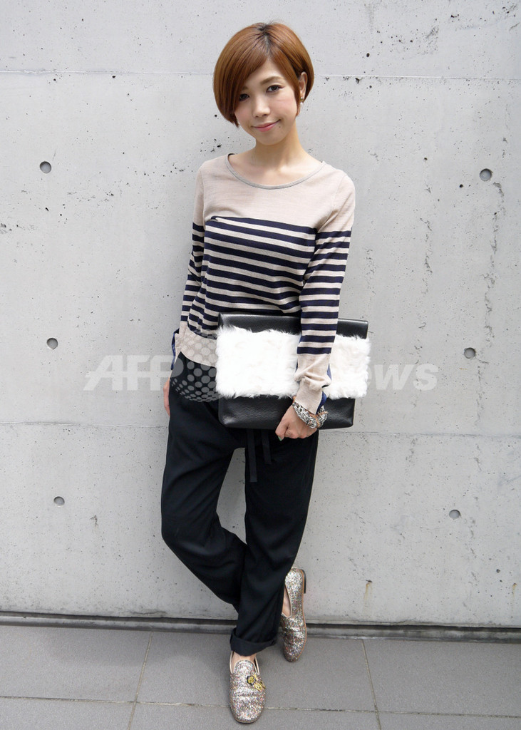 「ヒール主義で、 実は最近までフラットシューズには抵抗があった」と語るジェムプロジェクター(GEM projector)の尾花未来(Miki Obana)さんが普段愛用しているのは、「ハルミムトウ(HARUMI610)」のスリッポン。「ハルミムトウは、フェミニンなデザインで好きなブランド。このシューズは、グリッターのスリッポンにバッジが付いてメンズっぽ過ぎないデザインが気に入っています。実は同じ型でサテン地レオパードも持っています」と尾花さん。背面がシルク切り替えのボーダートップスとファーがアクセントのクラッチは東京ブランド「アンベル(AMBELL)」の新作だ。クラッチは付属のリボンを結んでショルダー使いもできる。