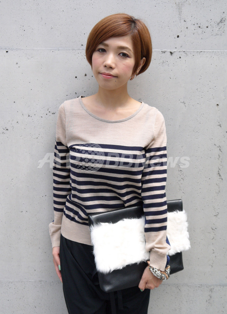 「ヒール主義で、 実は最近までフラットシューズには抵抗があった」と語るジェムプロジェクター(GEM projector)の尾花未来(Miki Obana)さんが普段愛用しているのは、「ハルミムトウ(HARUMI610)」のスリッポン。「ハルミムトウは、フェミニンなデザインで好きなブランド。このシューズは、グリッターのスリッポンにバッジが付いてメンズっぽ過ぎないデザインが気に入っています。実は同じ型でサテン地レオパードも持っています」と尾花さん。背面がシルク切り替えのボーダートップスとファーがアクセントのクラッチは東京ブランド「アンベル(AMBELL)」の新作だ。クラッチは付属のリボンを結んでショルダー使いもできる。