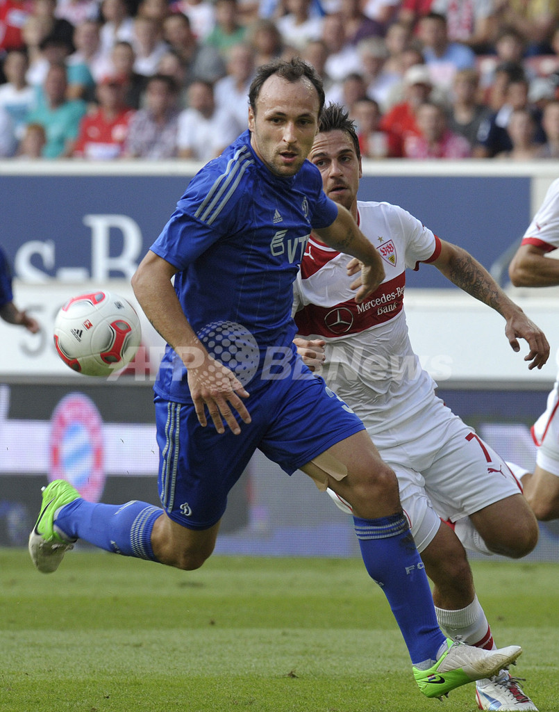 VfBシュツットガルトのマルティン・ハルニク(Martin Harnik、右)とボールを競るディナモ・モスクワのゴードン・シルデンフェルト(Gordon Schildenfeld、2012年8月22日撮影)。(c)AFP/THOMAS KIENZLE