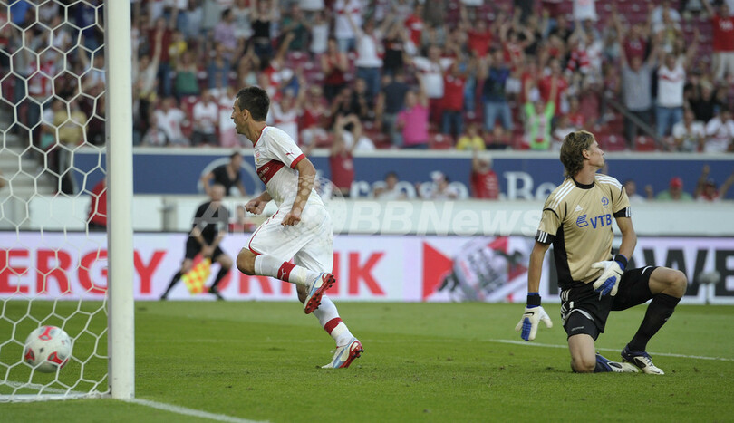 後半27分に先制ゴールを決め、歓喜するVfBシュツットガルトのヴェダド・イビシェヴィッチ(Vedad Ibisevic、左、2012年8月22日撮影)。(c)AFP/THOMAS KIENZLE