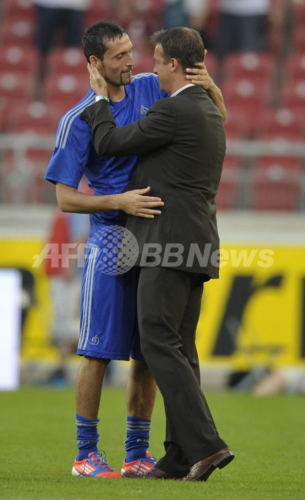 試合後にVfBシュツットガルトのフレディ・ボビッチ(Fredi Bobic、右)と言葉を交わすディナモ・モスクワのケヴィン・クラニー(Kevin Kuranyi、2012年8月22日撮影)。(c)AFP/THOMAS KIENZLE