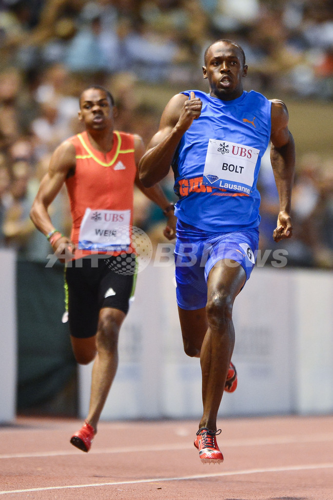 レースに臨むジャマイカのウサイン・ボルト(右、2012年8月23日撮影)。(c)AFP/FABRICE COFFRINI