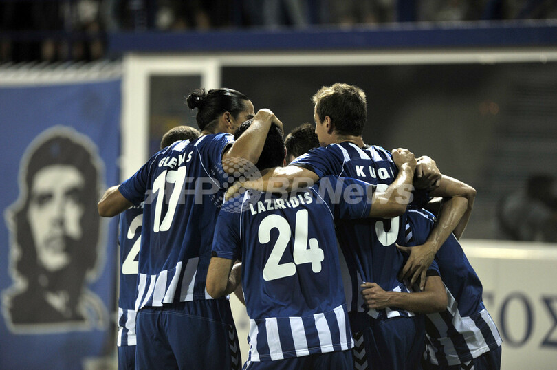 前半24分に先決まった先制点を喜ぶアトロミトスの選手(2012年8月23日撮影)。(c)AFP/LOUISA GOULIAMAKI