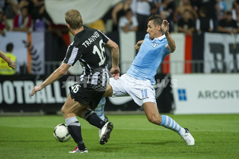 ムラのユレ・トラフネル(Jure Travner、左)とボールを競るラツィオのミロスラフ・クローゼ(Miroslav Klose、2012年8月23日撮影)。(c)AFP/JURE MAKOVEC
