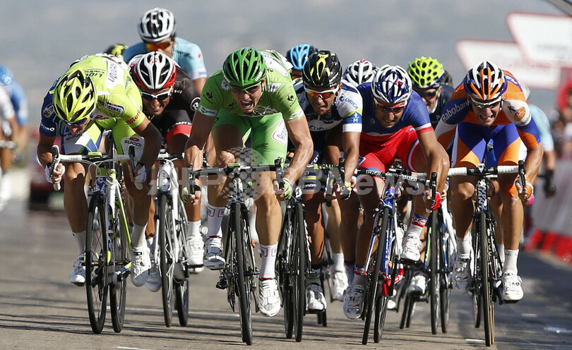 フィニッシュラインをトップで切るアルゴス・シマノのヨーン・デーゲンコルプ(2012年8月24日撮影)。(c)AFP/JOSE JORDAN
