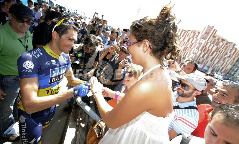レース後、ファンへのサインに応じるチーム・サクソバンク(Team Saxo Bank)のアルベルト・コンタドール(Alberto Contador、2012年8月24日撮影)。(c)AFP/JOSE JORDAN