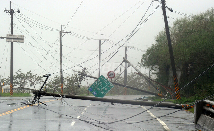 写真は南部・屏東(Pingtung)県の道路で、台風14号の強風でなぎ倒された電柱(2012年8月24日撮影)。(c)AFP/SAM YEH