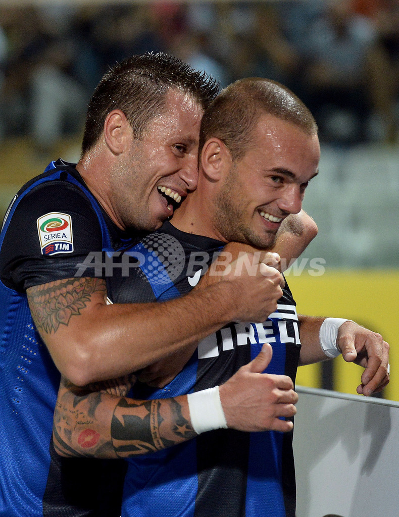 前半17分に先制点を挙げ、チームメイトのアントニオ・カッサーノ(Antonio Cassano)に祝福されるインテルのウェズレイ・スナイデル(Wesley Sneijder、2012年8月26日撮影)。(c)AFP/VINCENZO PINTO