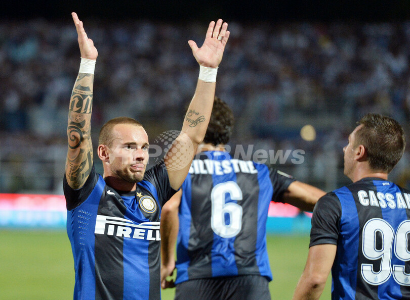 ライバルのACミラン(AC Milan)がシーズン初戦でまさかの敗戦を喫した一方で、インテルは前半17分にペナルティーエリア内でフリーでパスを受けたウェズレイ・スナイデル(Wesley Sneijder)が先制点を奪い、敵地で試合の主導権を握った。