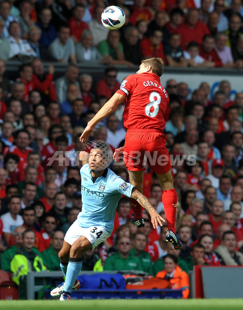 リバプールのスティーブン・ジェラード(Steven Gerrard、右)とボールを競るマンチェスター・シティのナイジェル・デ・ヨング(Nigel de Jong、2012年8月26日撮影)。(c)AFP/PAUL ELLIS
