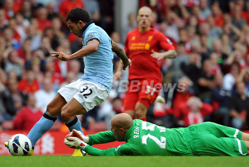 後半35分にリバプールのGKホセ・マヌエル・レイナ(Jose Manuel Reina、右)をかわして同点ゴールを決めるマンチェスター・シティのカルロス・テベス(Carlos Tevez、左、2012年8月26日撮影)。(c)AFP/PAUL ELLIS