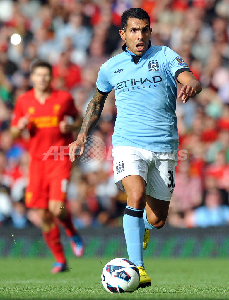 ドリブルでボールを運ぶマンチェスター・シティのカルロス・テベス(Carlos Tevez、2012年8月26日撮影)。(c)AFP/PAUL ELLIS
