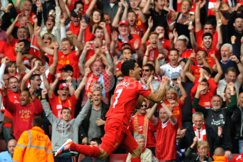 後半21分にチーム2得点目を挙げ、歓喜するリバプールのルイス・スアレス(Luis Suarez、2012年8月26日撮影)。(c)AFP/PAUL ELLIS
