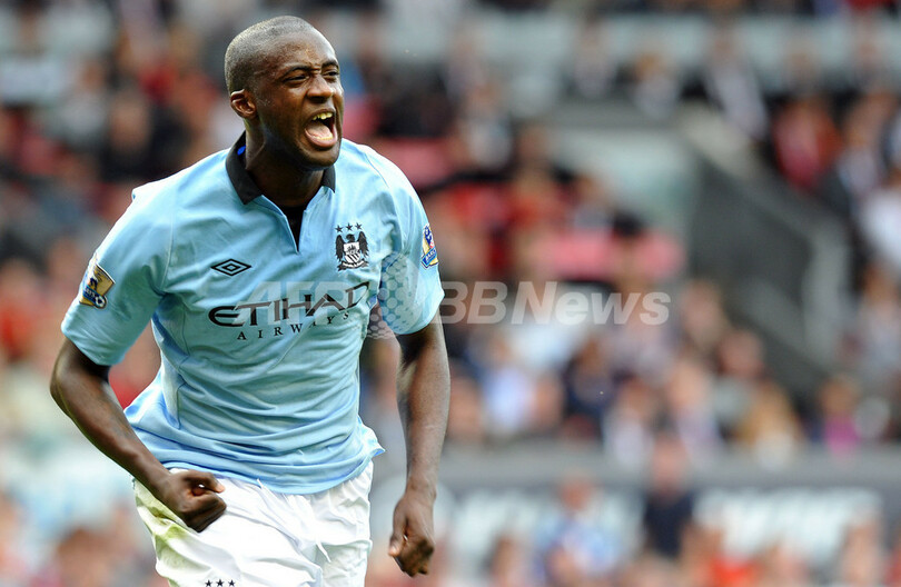 後半18分に同点ゴールを決め、歓喜するマンチェスター・シティのヤヤ・トゥーレ(Yaya Toure、2012年8月26日撮影)。(c)AFP/PAUL ELLIS