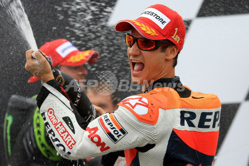 表彰台で祝杯を挙げるレプソル・ホンダのダニ・ペドロサ(Dani Pedrosa、2012年8月26日撮影)。(c)AFP/RADEK MICA