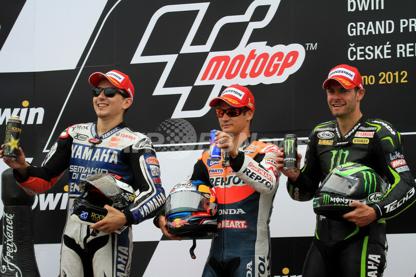 表彰式に臨む(左から)ヤマハ・ファクトリー(Yamaha Factory)のホルヘ・ロレンゾ(Jorge Lorenzo)、レプソル・ホンダのダニ・ペドロサ、モンスター・ヤマハ・テック3(Monster Yamaha Tech 3)のカル・クラッチロー(Cal Crutchlow、2012年8月26日撮影)。(c)AFP/RADEK MICA