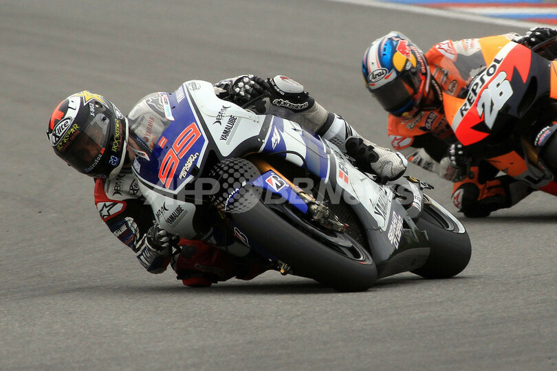 決勝でレプソル・ホンダのダニ・ペドロサからリードを奪う「ヤマハ・ファクトリー(Yamaha Factory)のホルヘ・ロレンゾ(Jorge Lorenzo、2012年8月26日撮影)。(c)AFP/RADEK MICA
