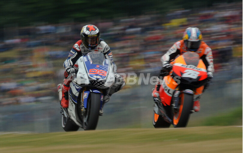決勝で争うヤマハ・ファクトリー(Yamaha Factory)のホルヘ・ロレンゾ(Jorge Lorenzo)とレプソル・ホンダのダニ・ペドロサ(2012年8月26日撮影)。(c)AFP/RADEK MICA