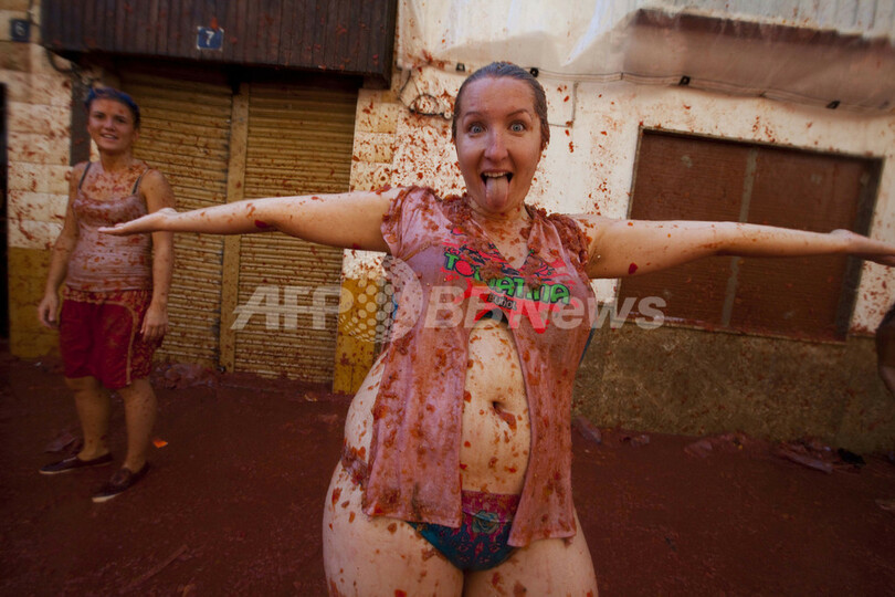 ブニョールは、スペイン第3の規模を誇る湾岸都市バレンシア(Valencia)から北に40キロほどにある農業地帯の中心部に位置する町。「トマティーナ」は毎年8月最後の水曜日に開催される。町当局はこの祭りで30万ユーロ(約3000万円)の経済効果を見込んでいる(2012年8月29日撮影)。(c)AFP/BIEL ALINO