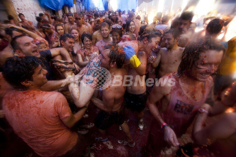ブニョールは、スペイン第3の規模を誇る湾岸都市バレンシア(Valencia)から北に40キロほどにある農業地帯の中心部に位置する町。「トマティーナ」は毎年8月最後の水曜日に開催される。町当局はこの祭りで30万ユーロ(約3000万円)の経済効果を見込んでいる(2012年8月29日撮影)。(c)AFP/BIEL ALINO