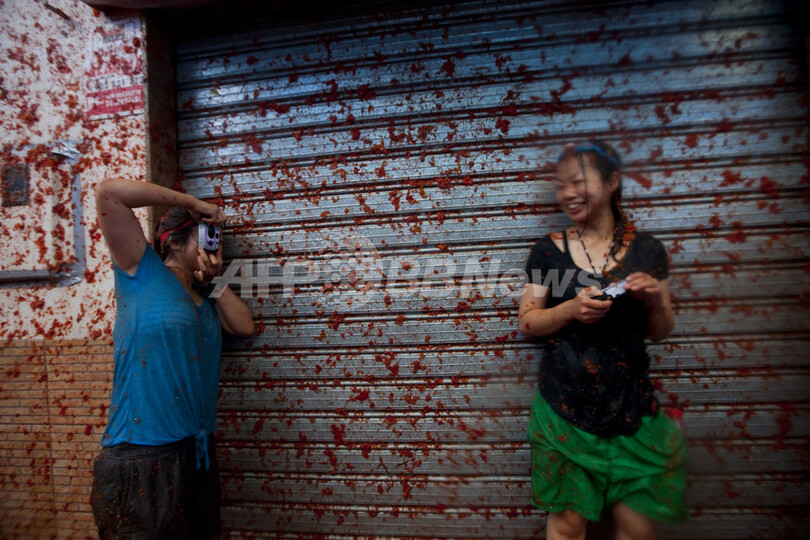 ブニョールは、スペイン第3の規模を誇る湾岸都市バレンシア(Valencia)から北に40キロほどにある農業地帯の中心部に位置する町。「トマティーナ」は毎年8月最後の水曜日に開催される。町当局はこの祭りで30万ユーロ(約3000万円)の経済効果を見込んでいる(2012年8月29日撮影)。(c)AFP/BIEL ALINO
