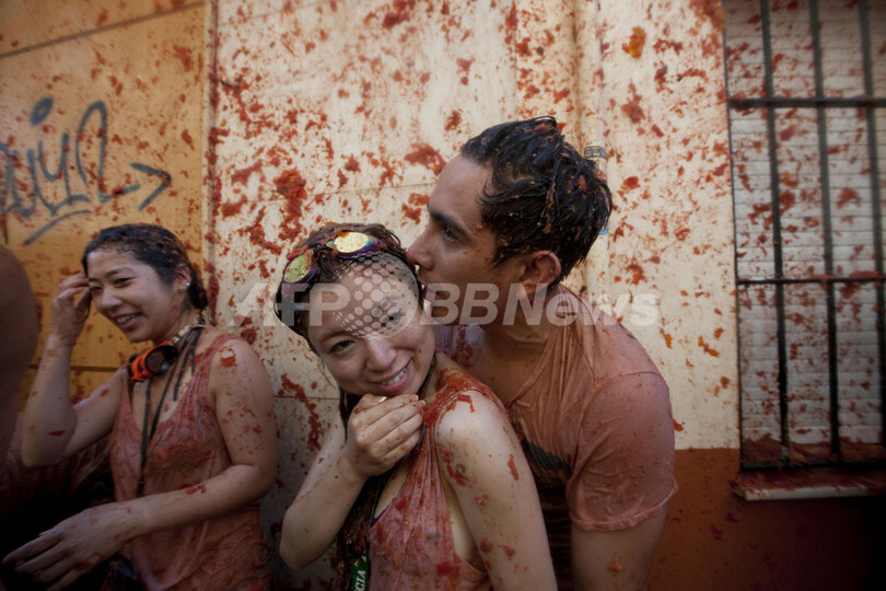ブニョールは、スペイン第3の規模を誇る湾岸都市バレンシア(Valencia)から北に40キロほどにある農業地帯の中心部に位置する町。「トマティーナ」は毎年8月最後の水曜日に開催される。町当局はこの祭りで30万ユーロ(約3000万円)の経済効果を見込んでいる(2012年8月29日撮影)。(c)AFP/BIEL ALINO