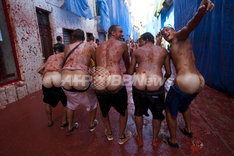 ブニョールは、スペイン第3の規模を誇る湾岸都市バレンシア(Valencia)から北に40キロほどにある農業地帯の中心部に位置する町。「トマティーナ」は毎年8月最後の水曜日に開催される。町当局はこの祭りで30万ユーロ(約3000万円)の経済効果を見込んでいる(2012年8月29日撮影)。(c)AFP/BIEL ALINO