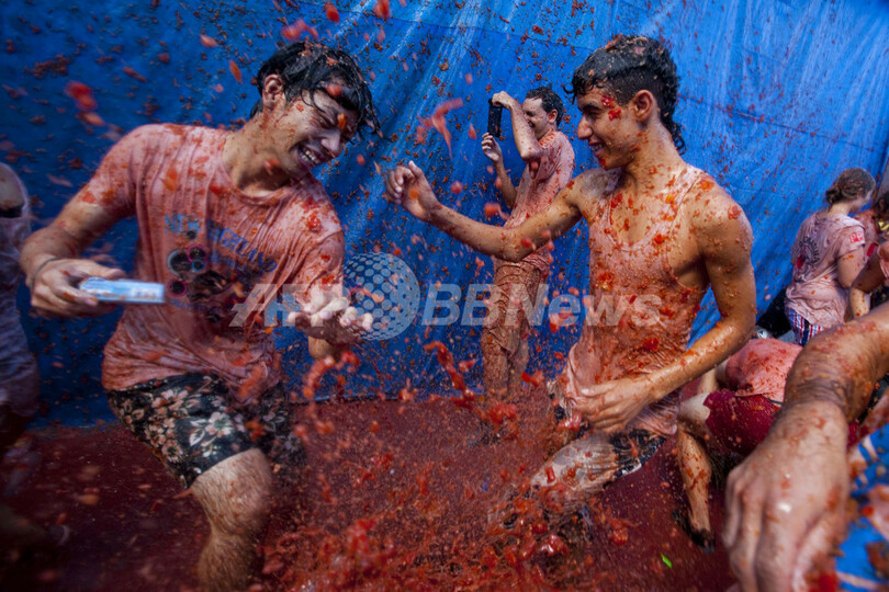 ブニョールは、スペイン第3の規模を誇る湾岸都市バレンシア(Valencia)から北に40キロほどにある農業地帯の中心部に位置する町。「トマティーナ」は毎年8月最後の水曜日に開催される。町当局はこの祭りで30万ユーロ(約3000万円)の経済効果を見込んでいる(2012年8月29日撮影)。(c)AFP/BIEL ALINO