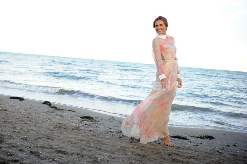 開幕に先駆け28日には、ベネチアの海岸でフォトコールが行われ、花柄プリントのロングドレスに身を包んだカシアが出席した。(c)AFP