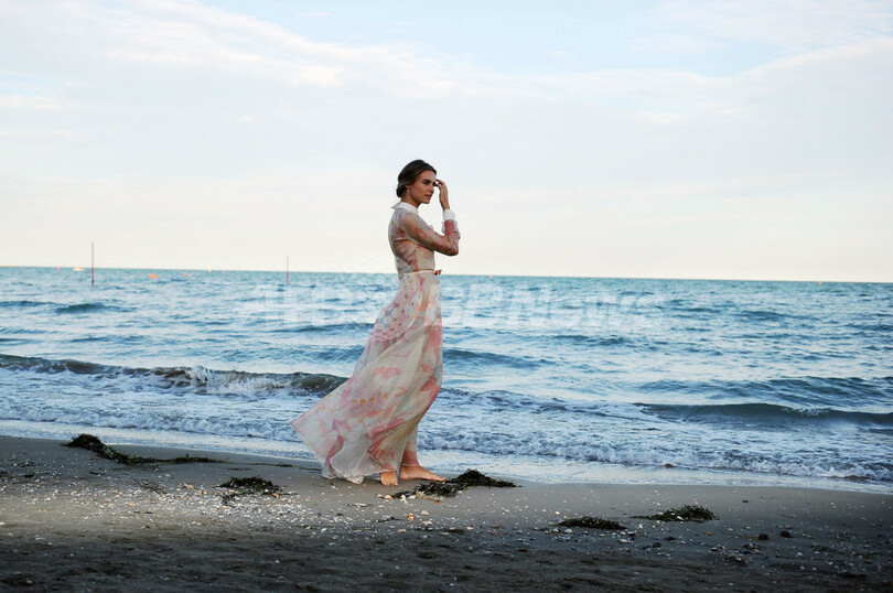 開幕に先駆け28日には、ベネチアの海岸でフォトコールが行われ、花柄プリントのロングドレスに身を包んだカシアが出席した。(c)AFP