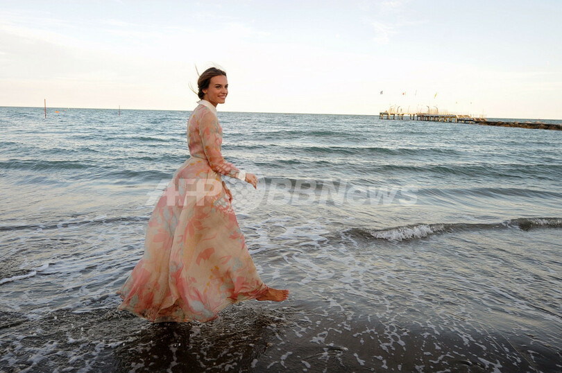 開幕に先駆け28日には、ベネチアの海岸でフォトコールが行われ、花柄プリントのロングドレスに身を包んだカシアが出席した。(c)AFP