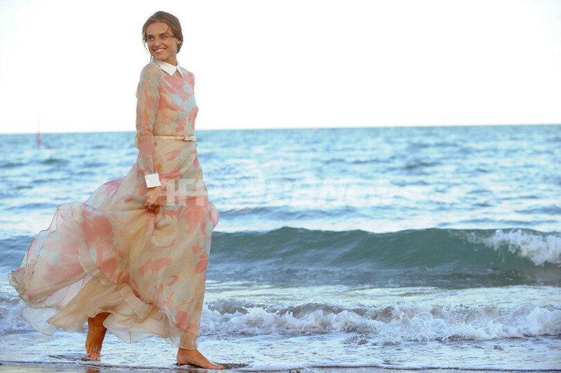 開幕に先駆け28日には、ベネチアの海岸でフォトコールが行われ、花柄プリントのロングドレスに身を包んだカシアが出席した。(c)AFP