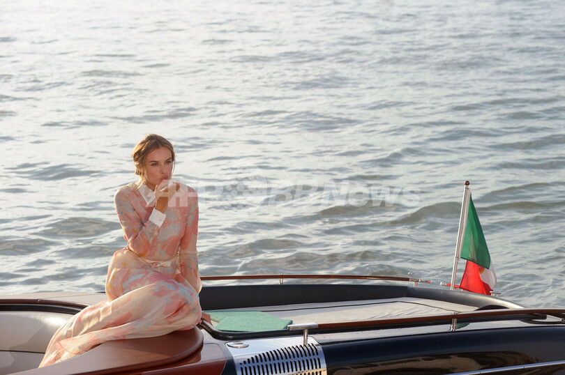 開幕に先駆け28日には、ベネチアの海岸でフォトコールが行われ、花柄プリントのロングドレスに身を包んだカシアが出席した。(c)AFP