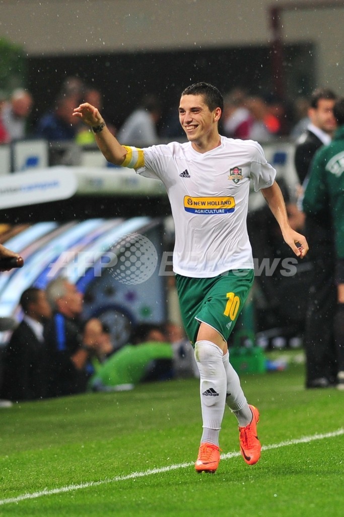 前半35分に先制点を挙げて歓喜するSCバスルイのニコラエ・スタンチュ(Nicolae Stanciu、2012年8月30日撮影)。(c)AFP/GIUSEPPE CACACE