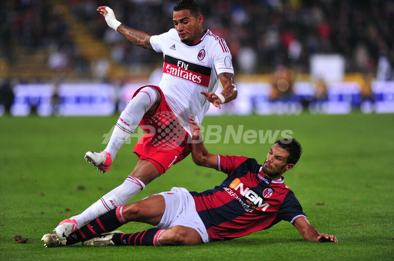 ボローニャのニコロ・ケルビン(Nicolo Cherubin、右)のスライディングタックルを受けるACミランのケヴィン・プリンス・ボアテング(Kevin Prince Boateng、2012年9月1日撮影)。(c)AFP/GIUSEPPE CACACE