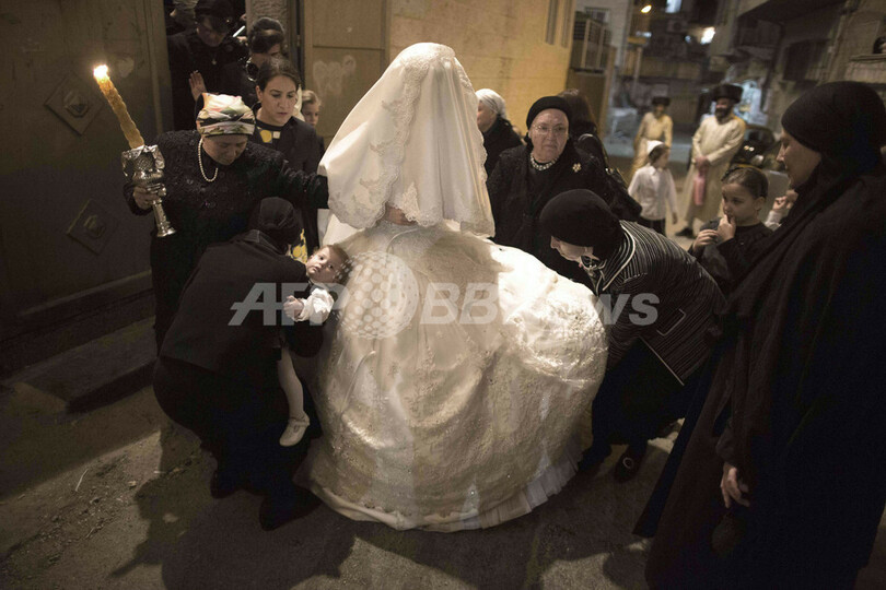 【9月2日 AFP】ユダヤ教超正統派の居住区であるエルサレム(Jerusalem)のメーアー・シェアーリーム(Mea Shearim)で執り行われたラビの孫娘の結婚式の様子。式の最後には、地元コミュニティーの住民や親族らが、新婦の前で踊るのがならわしとなっている。(c)AFP