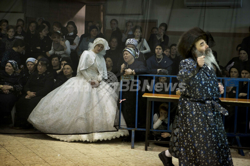 写真は、踊るラビを見る新婦(2012年8月28日撮影)。(c)AFP/MENAHEM KAHANA