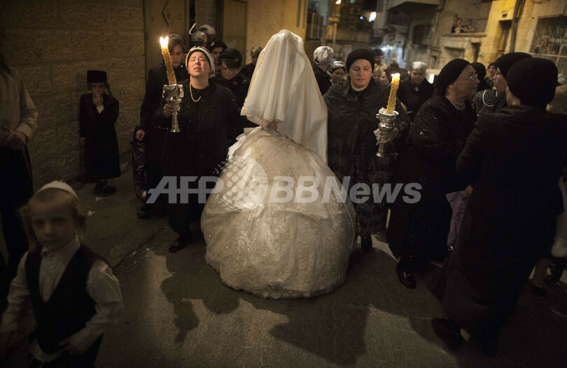 【9月2日 AFP】ユダヤ教超正統派の居住区であるエルサレム(Jerusalem)のメーアー・シェアーリーム(Mea Shearim)で執り行われたラビの孫娘の結婚式の様子。式の最後には、地元コミュニティーの住民や親族らが、新婦の前で踊るのがならわしとなっている。(c)AFP