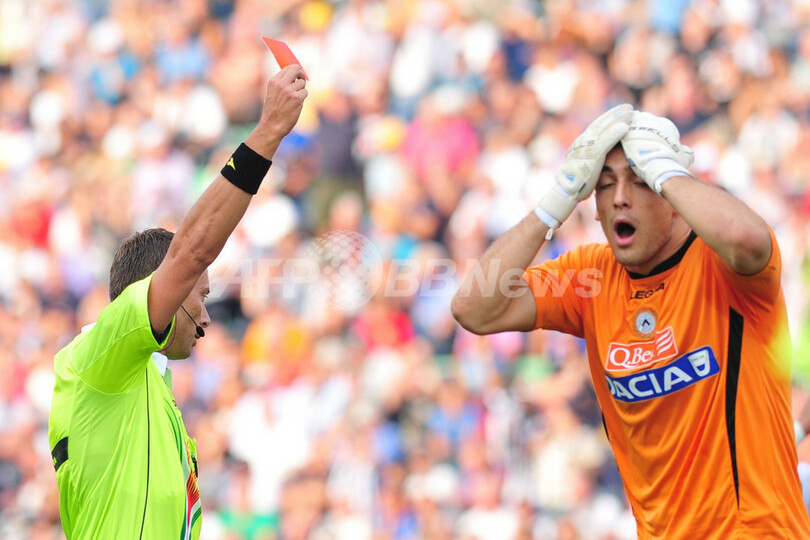 前半12分にレッドカードで退場処分となり、頭を抱えるウディネーゼのジェリコ・ブルキッチ(Zeljko Brkic、2012年9月2日撮影)。(c)AFP/GIUSEPPE CACACE