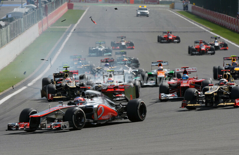 スタート直後の第1コーナーで発生した事故の様子(2012年9月2日撮影)。(c)AFP/TOM GANDOLFINI