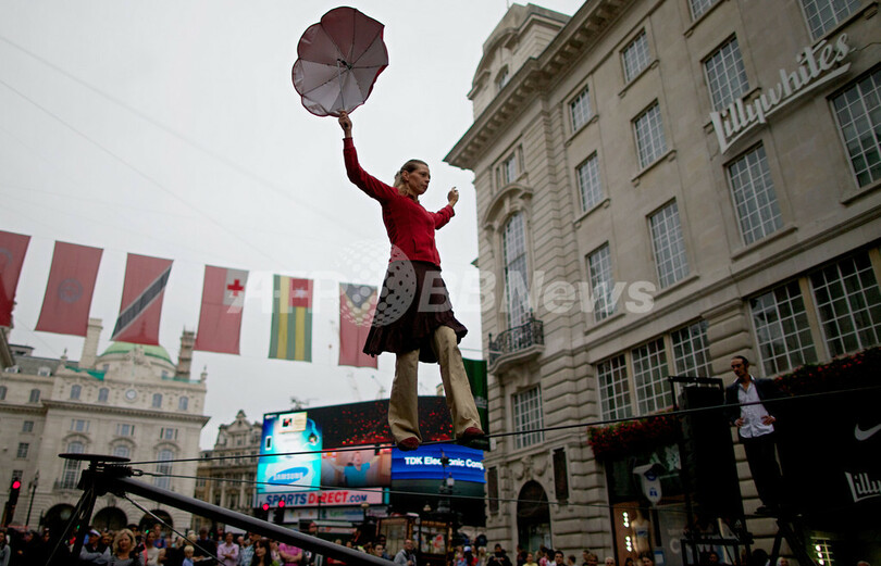 五輪イヤーを記念してロンドン市内の各地で開かれている芸術文化イベント「London 2012 Festival」の一環で、ピカデリー広場では「ピカデリーサーカス・サーカス」と題されたイベントに世界各国から250人のパフォーマーが集結。空中ブランコ、フラフープ芸、綱渡りなどを披露した(2012年9月2日撮影)。(c)AFP/ANDREW COWIE