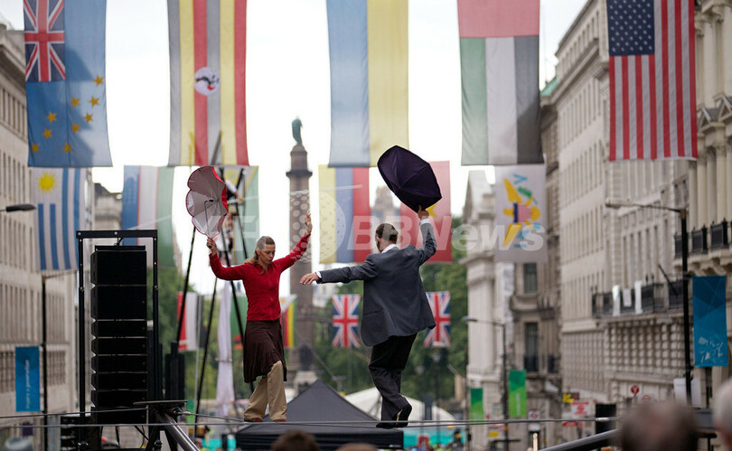 五輪イヤーを記念してロンドン市内の各地で開かれている芸術文化イベント「London 2012 Festival」の一環で、ピカデリー広場では「ピカデリーサーカス・サーカス」と題されたイベントに世界各国から250人のパフォーマーが集結。空中ブランコ、フラフープ芸、綱渡りなどを披露した。(c)AFP