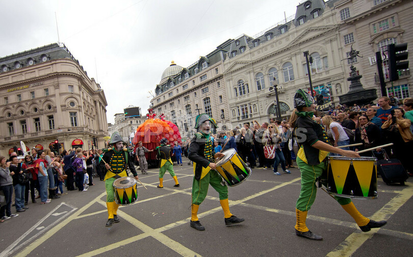 五輪イヤーを記念してロンドン市内の各地で開かれている芸術文化イベント「London 2012 Festival」の一環で、ピカデリー広場では「ピカデリーサーカス・サーカス」と題されたイベントに世界各国から250人のパフォーマーが集結。空中ブランコ、フラフープ芸、綱渡りなどを披露した。(c)AFP
