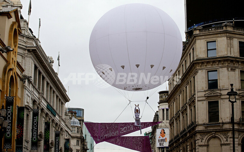 五輪イヤーを記念してロンドン市内の各地で開かれている芸術文化イベント「London 2012 Festival」の一環で、ピカデリー広場では「ピカデリーサーカス・サーカス」と題されたイベントに世界各国から250人のパフォーマーが集結。空中ブランコ、フラフープ芸、綱渡りなどを披露した。(c)AFP