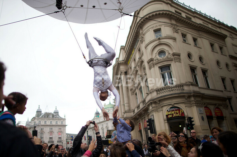 五輪イヤーを記念してロンドン市内の各地で開かれている芸術文化イベント「London 2012 Festival」の一環で、ピカデリー広場では「ピカデリーサーカス・サーカス」と題されたイベントに世界各国から250人のパフォーマーが集結。空中ブランコ、フラフープ芸、綱渡りなどを披露した。(c)AFP