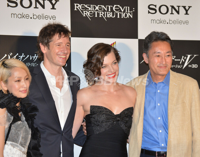 都内で3日、人気シリーズ最新作『バイオハザードV:リトリビューション(Resident Evil: Retribution)』のワールドプレミアが開催され、来日した主演のミラ・ジョヴォヴィッチ(Milla Jovovich)と夫でもあるポール・W・S・アンダーソン(Paul W.S. Anderson)監督らが登場した。写真は、カメラに向かってポーズを取る(左から)共演の中島美嘉(Mika Nakashima)、アンダーソン監督、ジョヴォヴィッチ、ソニーの平井一夫(Kazuo Hirai)CEO(2012年9月3日撮影)。(c)AFP/KAZUHIRO NOGI